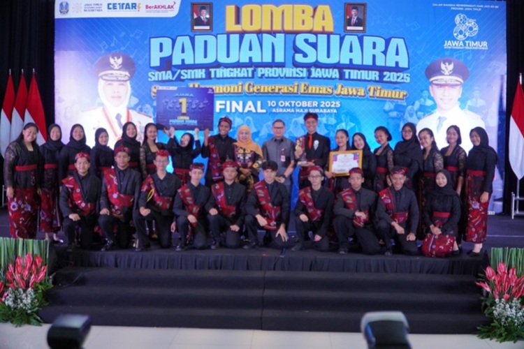 Surabaya, Nawacita | Gubernur Jawa Timur, Khofifah Indar Parawansa, secara langsung menyerahkan hadiah kepada para pemenang Lomba Paduan Suara SMA/SMK Tingkat Provinsi Jawa Timur Tahun 2025. Kegiatan yang mengusung tema “Suara Harmoni Generasi Emas Jawa Timur” ini digelar oleh Dinas Pendidikan Provinsi Jawa Timur di Asrama Haji Surabaya, Jumat (10/10/2025).