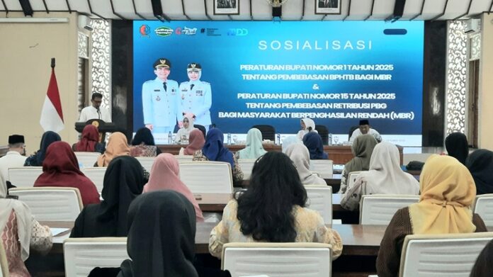 Badan Pendapatan Daerah (BAPENDA) Bojonegoro, mesosialisasikan Peraturan Bupati (Perbup Nomor 1 Tahun 2025 tentang Pembebasan BPHTB bagi MBR (Masyarakat Berpenghasilan Rendah) dan Peraturan Bupati Nomor 15 tentang pembebasan retribusi PBG, Rabu (22/10/2025).