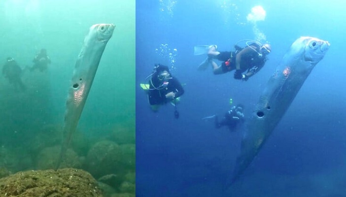 Ikan itu adalah jenis oarfish yang biasanya ditemukan pada kedalaman 200 hingga 1000 kaki di bawah permukaan air laut. Tubuhnya berwarna silver dengan aksen glitter yang berkilau.