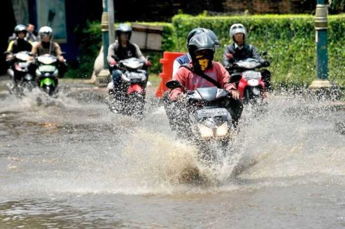 Pengendara sepeda motor kadang menghadapi dilema ketika menghadapi hujan dan banjir, apakah harus menghentikan kendaraan atau tetap melanjutkan perjalanan.