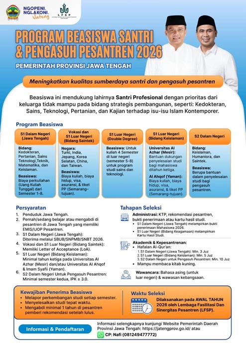 Semarang, Nawacita | Program beasiswa santri dan pengasuh pesantren tahun 2026 dari Gubernur Jateng Ahmad Luthfi dan Wakilnya Taj Yasin Maimoen (Gus Yasin), sudah diluncurkan. Seleksi akan dilakukan pada awal 2026. Informasi pendaftaran bisa diakses melalui laman resmi Pemprov Jateng https://jatengprov.go.id.