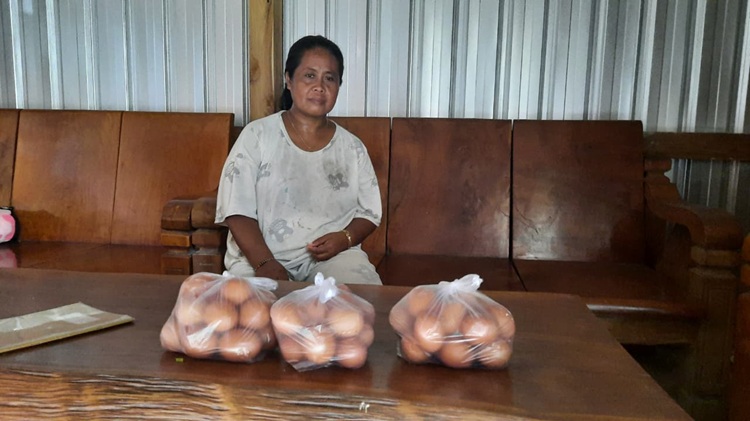 Dariatun menunjukkan telur hasil merawat ayam Program GAYATRI dari kandang yang ada di halaman rumahnya.