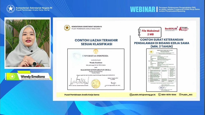 JAKARTA, Nawacita – Kementerian Sekretariat Negara melalui Pusat Pembinaan Analis Kerja Sama (Pusbin AKS) menyelenggarakan Web Seminar (Webinar) Pelaksanaan Pengangkatan Pegawai Negeri Sipil (PNS) ke dalam Jabatan Fungsional Analis Kerja Sama (JF AKS) melalui Penyesuaian/Inpassing bagi aparatur sipil negara (ASN) di instansi pusat dan daerah.
