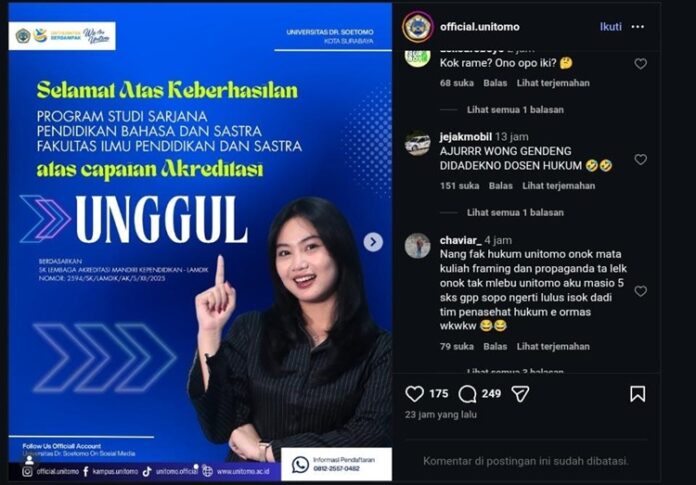 Surabaya, Nawacita | Akun Instagram Universitas Dr Soetomo (Unitomo) @official.unitomo diserbu ratusan komentar warganet. Hingga akhirnya akun Instagram Unitomo membatasi komentar pada postingan di akun Instagramnya. Netizen menyampaikan kritikan terkait dugaan salah satu dosen di universitas tersebut yang berkaitan dengan organisasi kemasyarakatan (ormas) Madura Asli Sedarah (Madas).