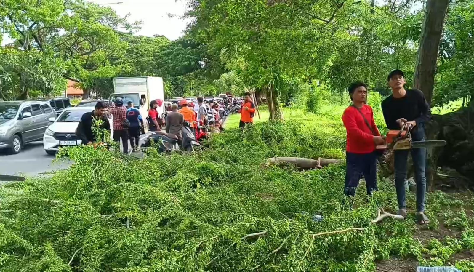 Arus lalu lintas di kawasan tersebut juga sempat terganggu dan terjadi kemacetan panjang akibat pohon yang menutupi sebagian jalan.
