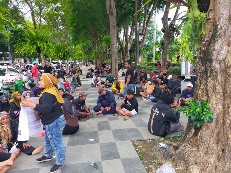 Pedagang dan jagal menuntut Walikota Surabaya Eri Cahyadi keluar dari Balai Kota dan menemui pengunjuk rasa secara langsung.