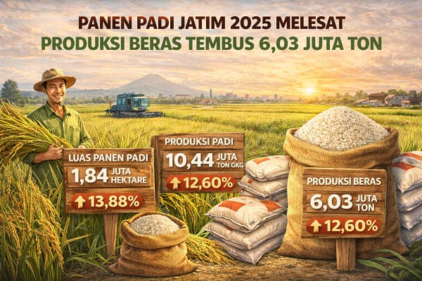 Ia menjelaskan, jika dikonversikan menjadi beras untuk konsumsi pangan penduduk, produksi beras Jawa Timur pada 2025 tercatat mencapai 6,03 juta ton. Jumlah ini juga mengalami kenaikan 0,67 juta ton atau 12,60 persen dibandingkan tahun sebelumnya yang sebesar 5,35 juta ton.