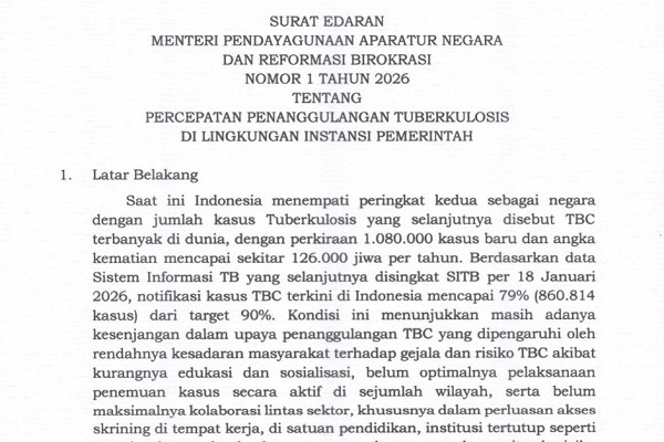JAKARTA, Nawacita – Percepatan penanggulangan tuberkulosis (TBC) menjadi salah satu program prioritas pemerintah di bidang kesehatan, dengan target menurunkan kasus TBC hingga 50 persen dalam lima tahun. Sebagai bagian dari implementasi program tersebut, Menteri Pendayagunaan Aparatur Negara dan Reformasi Birokrasi (PANRB) Rini Widyantini menerbitkan Surat Edaran (SE) Nomor 1 Tahun 2026 tentang Percepatan Penanggulangan Tuberkulosis di Lingkungan Instansi Pemerintah. Link klik Disini.