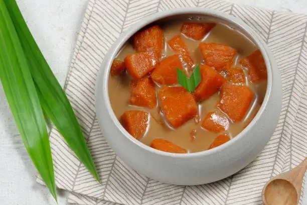 Setup memiliki tampilan yang mirip dengan kolak, karena berkuah cokelat. Agar semakin lezat jangan lupa tambahkan daun pandan yang direbus bersamaan.