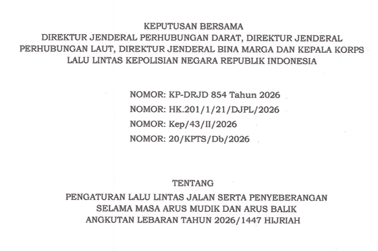 Jakarta, Nawacita | Pemerintah melalui Kementerian Perhubungan (Kemenhub), Kementerian Pekerjaan Umum (PU), dan Korps Lalu Lintas Kepolisian Negara Republik Indonesia (Kakorlantas Polri) menerbitkan Surat Keputusan Bersama (SKB) tentang Pengaturan Lalu Lintas Jalan serta Penyeberangan Selama Masa Arus Mudik dan Arus Balik Angkutan Lebaran 2026/1447 Hijriah.