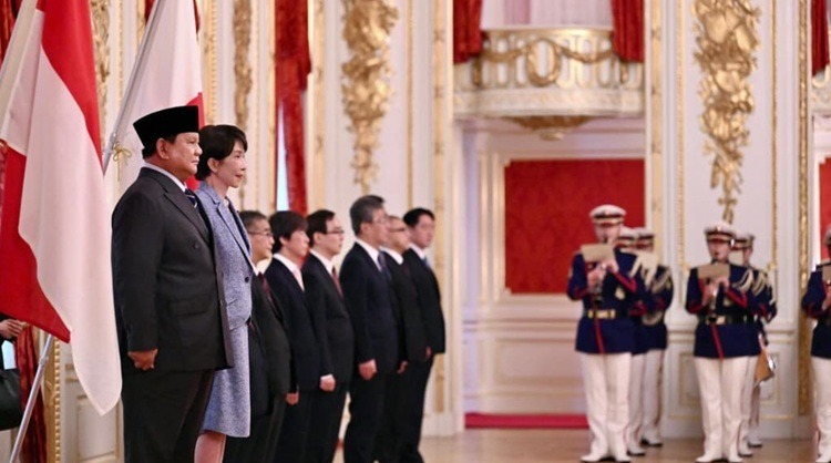 Selanjutnya, Presiden Prabowo bersama PM Takaichi melakukan inspeksi pasukan kehormatan. Setelah itu, kedua pemimpin memberikan penghormatan kepada bendera masing-masing negara sebagai bentuk saling menghormati kedaulatan dan persahabatan antarbangsa.