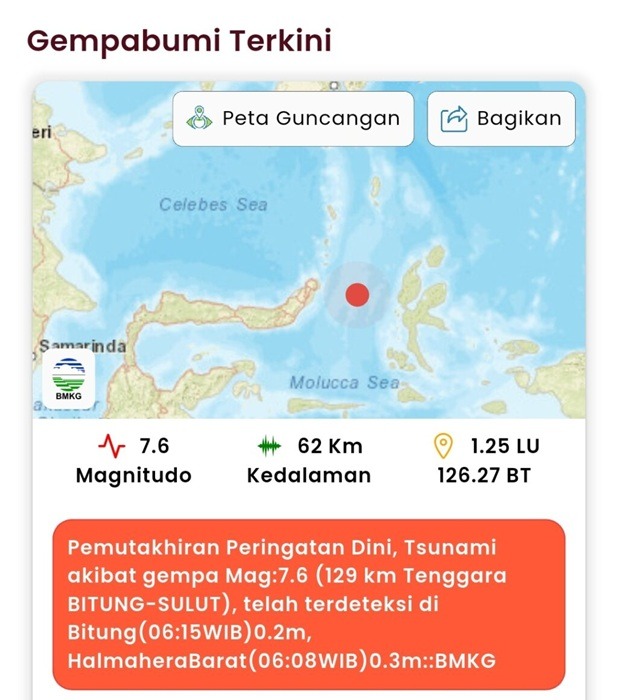 Gempa M 7,6 Guncang Bitung Sulut, Terjadi Tsunami 0,3 Meter di Halmahera Barat