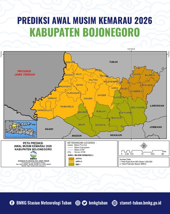 Berdasarkan BMKG Tuban, prediksi awal musim kemarau Kabupaten Bojonegoro 2026 terbagi tiga dasarian. April Dasarian II (tanggal 11-20) Kecamatan Balen, Baureno, Kanor, Kepohbaru; April Dasarian III (tanggal 21-30) Kecamatan Bojonegoro, Dander, Gayam, Kalitidu, Kapas, Kasiman, Kedewan, Malo, Margomulyo, Ngasem, Ngrahoz, Padangan, Purwosari, Tambakrejo, Trucuk; Mei Dasarian I (tanggal 1-10) Kecamatan Bubulan, Gondang, Kedungadem, Ngambon, Sekar, Sugihwaras, Sukosewu, dan Temayang.