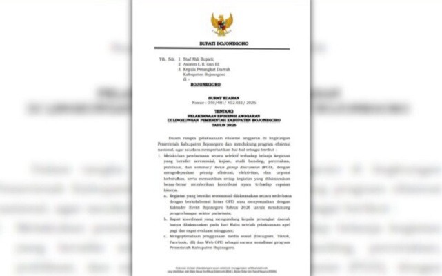 BOJONEGORO, Nawacita – Dalam rangka pelaksanaan efisiensi anggaran di lingkungan Pemerintah Kabupaten Bojonegoro dan mendukung program efisiensi nasional, Bupati Bojonegoro Setyo Wahono resmi menerbitkan Surat Edaran Nomor : 050/481/ 412.022/ 2026 tentang Pelaksanaan Efisiensi Anggaran di Lingkungan Pemerintah Kabupaten Bojonegoro Tahun 2026.