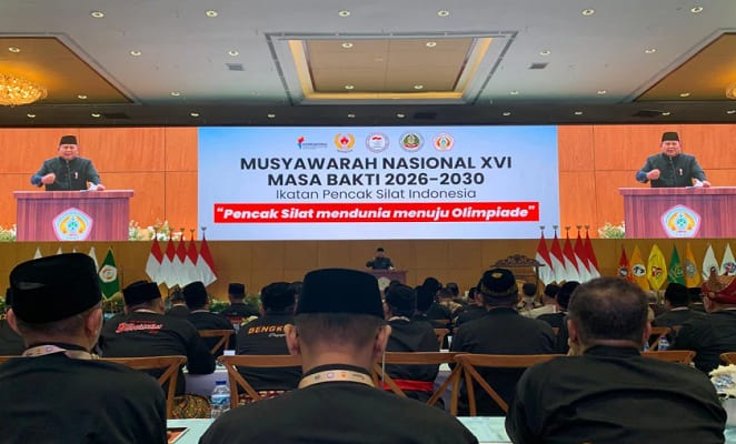 JAKARTA, Nawacita – Presiden Prabowo Subianto menegaskan komitmen kuat untuk mendorong pencak silat semakin mendunia hingga menembus Olimpiade. Komitmen tersebut disampaikan oleh Presiden dalam sambutannya pada Musyawarah Nasional (Munas) XVI Ikatan Pencak Silat Indonesia Masa Bakti 2026–2030 di Jakarta International Convention Center (JICC), Jakarta, pada Sabtu, 11 April 2026.