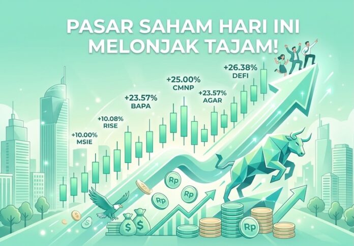 Nawacita – Pasar saham hari ini Senin 20 April 2026 diwarnai dengan kabar gembira bagi para investor karena sejumlah harga saham terpantau melonjak cukup tinggi. Di urutan pertama ada saham PT Danasupra Erapacific Tbk atau yang dikenal dengan kode DEFI yang harganya terbang hingga 26,38 persen ke level 206 Rupiah.