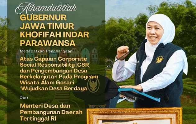 “Alhamdulillah kami menerima Penghargaan Corporate Social Responsibility (CSR) dan Pengembangan Desa Berkelanjutan (PDB) Award Tahun 2026 dari Kementerian Desa dan Pembangunan Daerah Tertinggal,” kata Gubernur Khofifah di Surabaya.